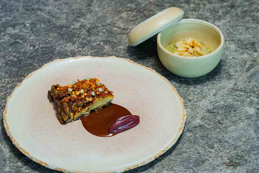 • Jamur Raja | Biji Bunga Matahari | Ara – Jamur King Blue panggang dengan glasir lembut, disajikan bersama irisan jamur eryngii, pure buah ara, saus akar-akaran, biji bunga matahari, serta keju Mae Lao yang berumur.